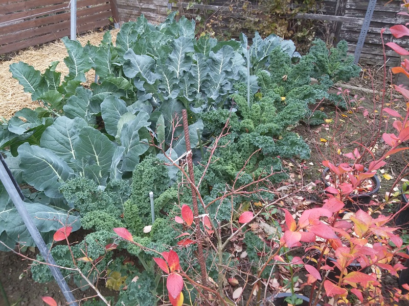 Ich hatte 12 Winterblumenkohl gepflanzt, im August mit vorgezogenen Pflanzen. Es gab mindestens 2 Ausfälle, aber der Rest ist noch ok, trotz massenhaft weiße Fliege. Die haben sogar die Meisen runtergepickt. August war wohl zu früh, der ist recht weit entwickelt. Ernte erwarte ich im April/Mai, wenns keinen Superkahlfrostwinter gibt. Im Bild die 2 Reihen hinten, er hat etwas anderes Laub als Broccoli und Romanesco davor. Hintendran steht noch eine Reihe Lauch mit Zwiebelfliege.