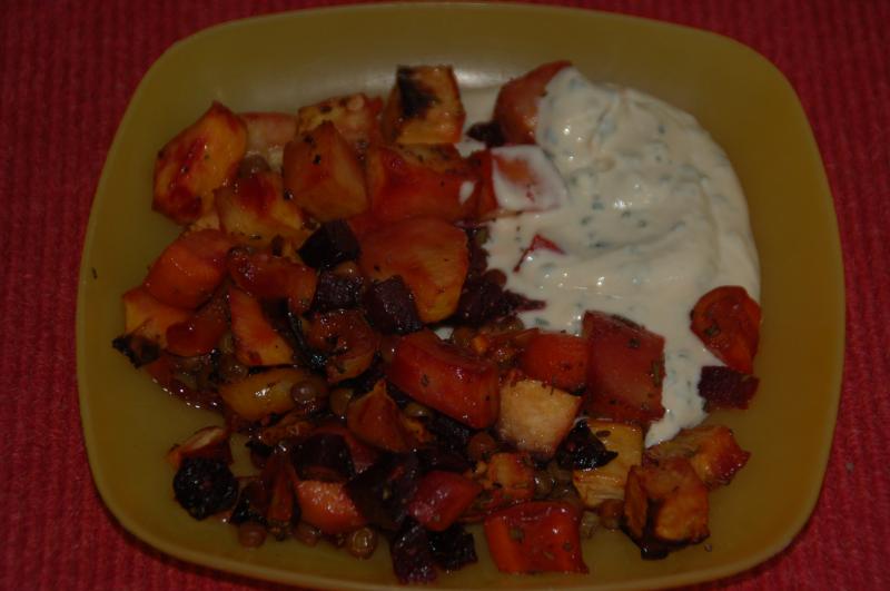 herbstliches Backofengemüse (Steckrübe, rote Bete, Pastinake, Möhre, Dörräpfel, Paprika, Erbsen, Rosmarin, Montreal Steak Seasoning, Salz) mit Dip (saure Sahne, Slaz, Kubebenpfeffer, Rübenkraut, Schnittlauch)
