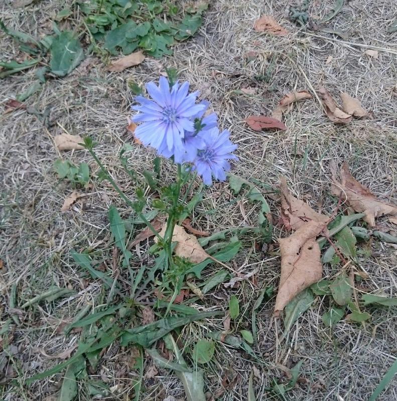 Auf dem Weg zum Zweitgarten sah ich am Straßenrand Wegwarte blühen und fragte mich noch, wann es mir gelingen würde, sie endlich auf der Wiese anzusiedeln. Und was sehe ich da, an einer Stelle, die ich nie gieße? Ein tröstliches Blau in dürrer Umgebung.