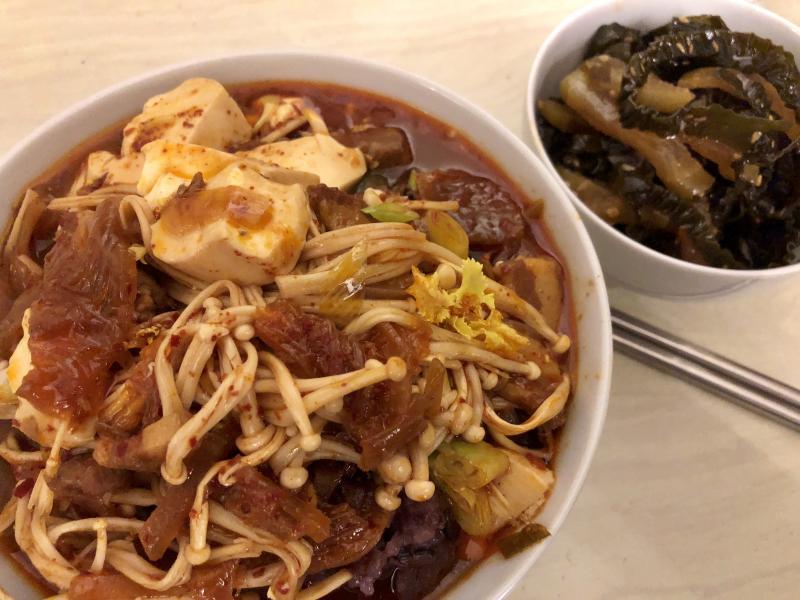 und als beilage zuckerkelp-korearettich-salat, wakame-ähnlich, ich habe ihn scharfsüßsauer abgeschmeckt