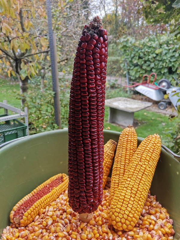 Bei Zuckermais probiere ich immer mal einen Kolben, wenn die Haare anfangen zu verfärben. Sobald die Körner die endgültige Größe und Milchreife erreicht haben, ernte ich die Kolben und friere die Körner ein (in Dosen oder wiederverschließbare Tüten, damit ich immer wieder was entnehmen kann, was ich grad in der Küche brauche). Wenn die Kolben zu lange an der Pflanze bleiben, wird mehr Zucker in Stärke umgewandelt, die Körner schmecken dann eher mehlig. Getrocknet werden bei mir nur alle paar Jahre ein, zwei der allerschönsten Kolben, damit ich wieder frisches Saatgut habe.