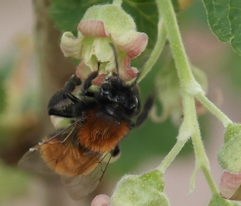 Das müsste die rotpelzige Sandbiene sein. Die hat offensichtlich eine Vorliebe für die schwarze Johannisbeere, dort sehe ich sie öfters.