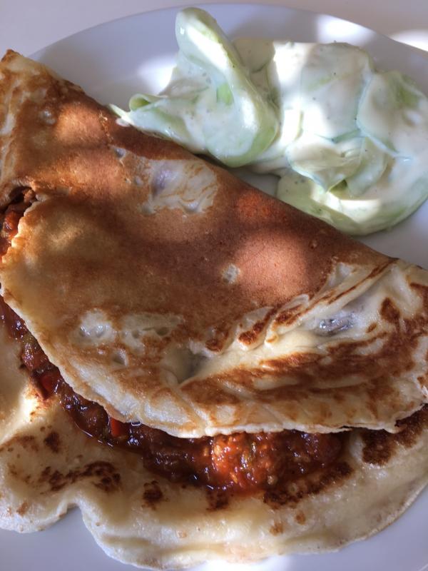 Pfannkuchen mit Hackfleischfüllung und Gurkensalat