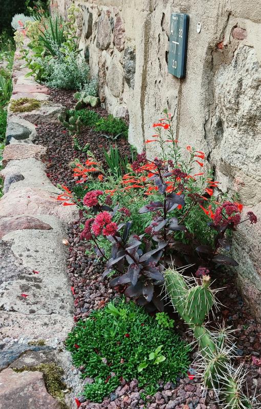 Der neu bepflanzte Streifen aus #180 hat sich richtig gut entwickelt. Etliche Kakteen haben geblüht, derzeit trumpft Zauschneria, der der Platz offenbar sehr gefällt.