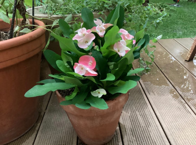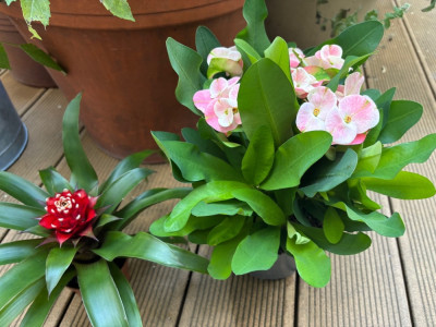 Google lens führte mich bei der rosafarbenen Pflanze zu viele Fotos von Euphorbia milii/ Christusdorn. Hier eins aus Mein schöner Garten .