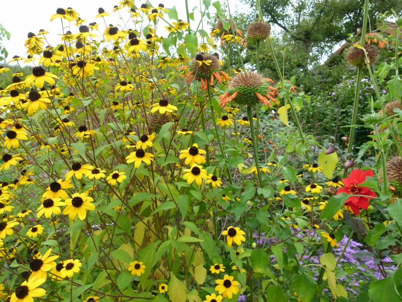 Ipomoea lobata, Nicotiana alata, Rudbeckia tripartita vermitteln noch Üppigkeit im Herbst.