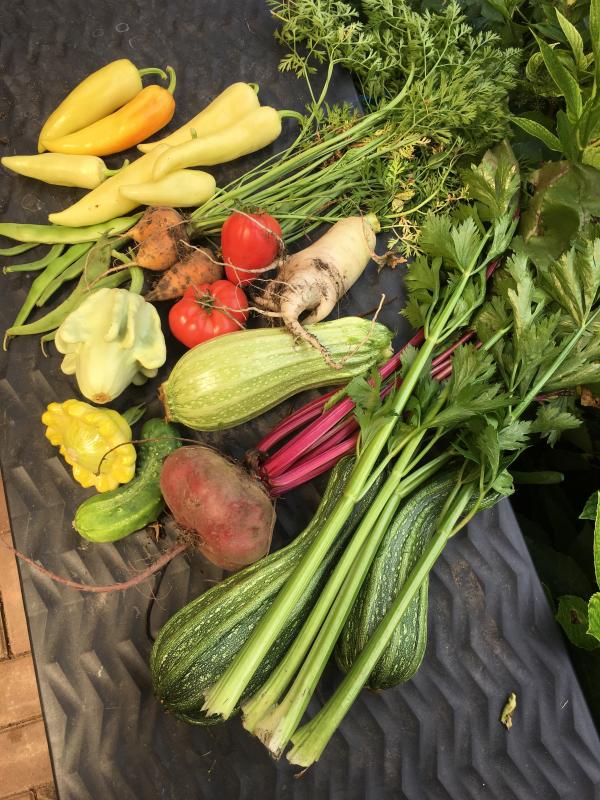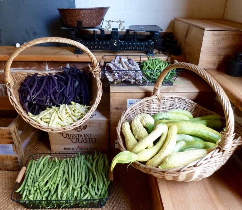 Dazu noch den fast täglichen Pflücksalat + Kräuter (Basilikum, Thymian, Oregano, Sarriette, Knolauch, Petersilie und Schnittlauch), sowie eine Portion Buschbohnen.