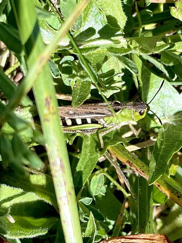 Blauflüglige Ödlandschrecken sahen wir gestern in Massen, aber nicht im Garten. Die Tiere hier im Garten haben sich versteckt, wir fanden gestern abend eins, konnten es aber nicht zum Fliegen animieren, vielleicht war das doch eher eine Dornschrecke. Es gibt hier viele verschiedene. Ich weiß es einfach nicht.