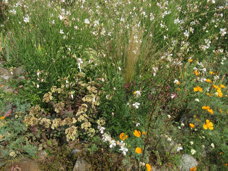 Hier ist wieder Gaura dominant (habe aber schon ordentlich rausgerupft). Zu ihren Füßen ist u.a. Sedum erblüht, Scabiosa ochroleuca ist auch zu sehen ;).