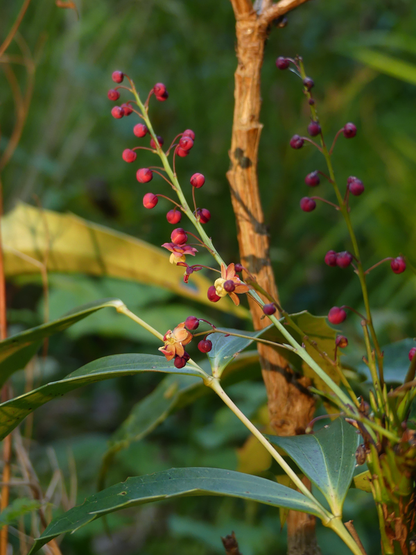 Diese Mahonie - gekauft als M. gracilipes, aber wohl eine Hybride - öffnet ihre zarten Blüten. Etwas für den zweiten Blick.