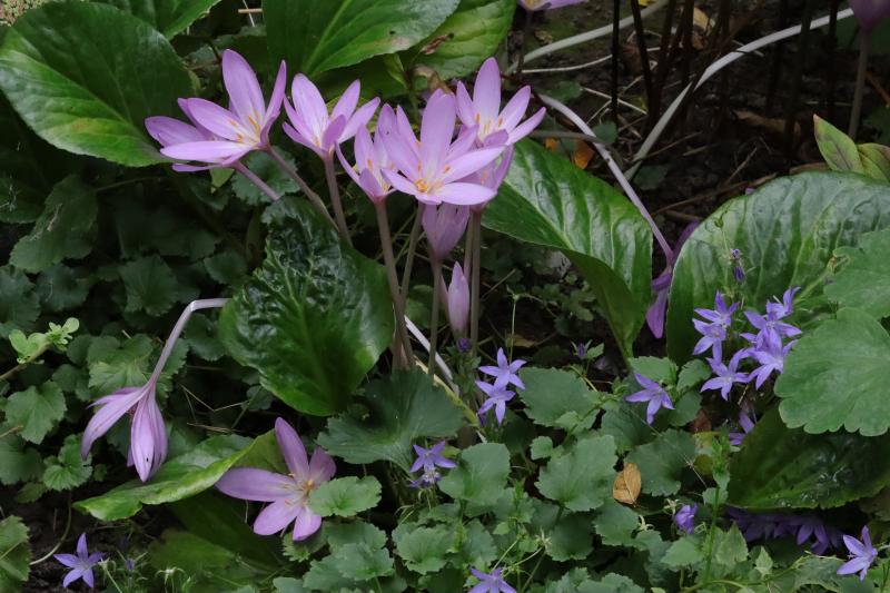 Zu den Herbstzeitlosen hat sich Campanula poscharskyana mit einer Nachblüte gesellt.