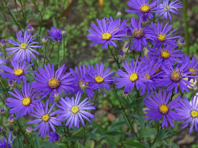 Aster amellus 'Veilchenkönigin'.Für mich die schönste Aster amellus Sorte.Auf dem Weg zur Arbeit sehe ich die immer in Massen, in einem Gräsermeer auf einer Verkehrsinsel.Standfest und leuchtend.
