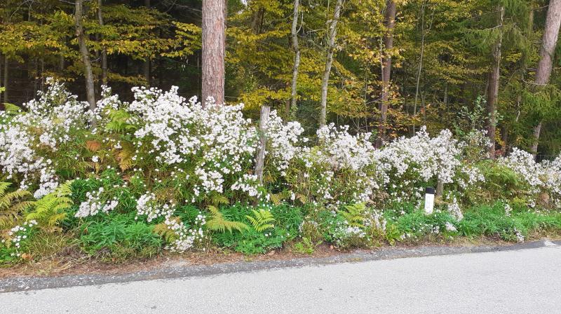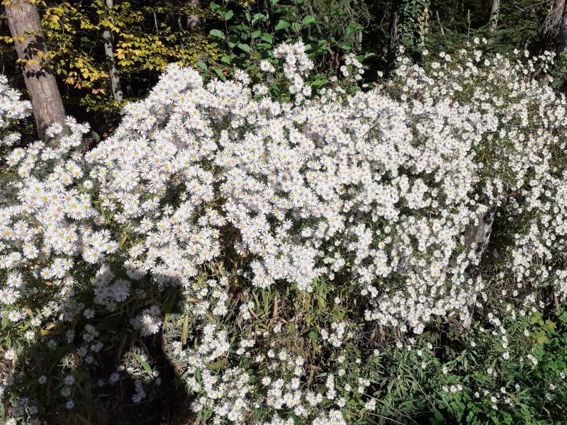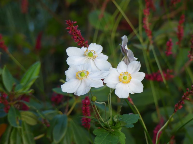Fast schon eine Überraschung: 'Honorine Jobert'. Die weißen Anemonen sind hier zickig. Ausgerechnet zwischen Tanne und Fichte, wo es auch noch sehr trocken war über den Sommer, blühen sie nun wie selbstverständlich.