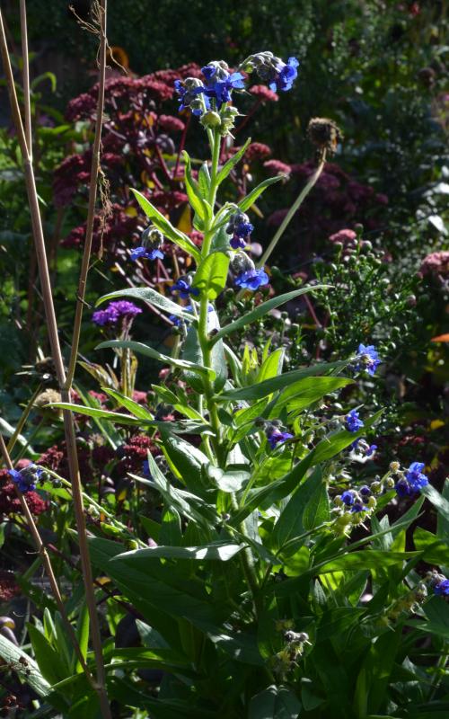 Danke, die ist trotzdem schön, selbst wenn falsch. Ich meinte aber das, was nur ganz klein und blitzeblau in der rechten Mitte hinten durchguckt. Denke aber, dass die zungenförmigen Blätter dazugehören, die drumherum erkennbar sind. Lindelofia longiflora? (Die macht hier auch noch ein paar Blüten, ist bei mir aber ein winzig am Boden liegendes Ding.)