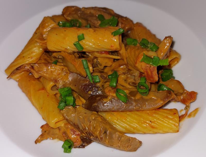Beim Spazierengehen haben wir Austernseitlinge gefunden. Die gab's gebraten mit Tomaten und Knoblauch, dazu die ersten Winterheckenzwiebeln aus dem Garten