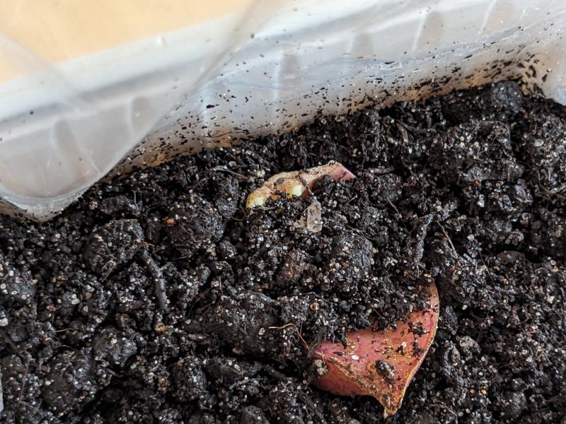 Also besonderes Glück hatte die gekaufte Zwiebel noch so eine "Babyzwiebel" mit dran, die hab ich auch eingepflanzt und sie zeigt schon einen zarten Trieb. :)