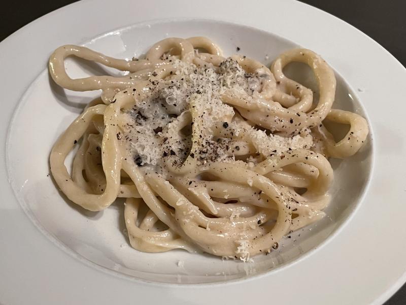 Heute mal wieder Pasta ... Pici (handgerollte dicke Spaghetti) mit cacio e pepe. Man braucht nur Pecorino und Pfeffer und etwas Nudelwasser. :D