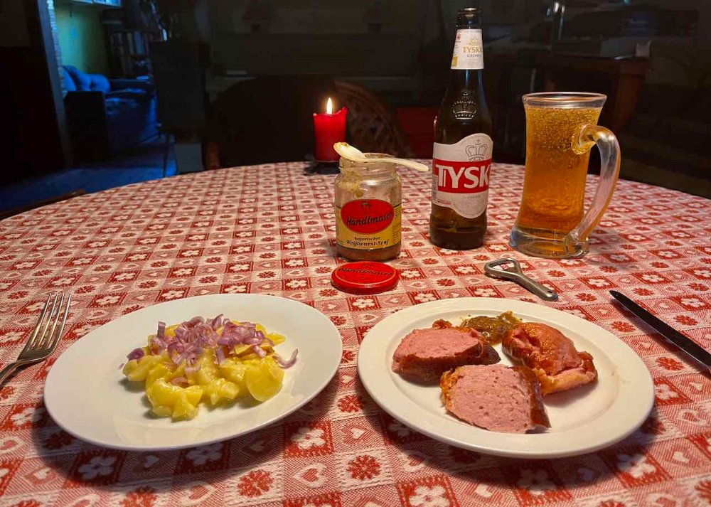 Witterungsbedingt heute ganz einfach: Leberkäs im Bratofen aufgebacken mit süßem Senf und kalter Kartoffelsalat mit Schalotten zum polnischen Tyskie-Bier