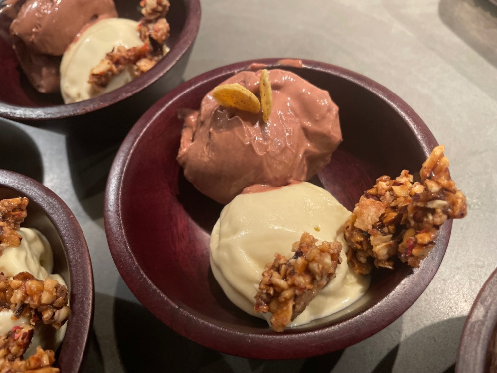 Käse (wurde mitgebracht) gab es dann auch noch und als keiner mehr Papp sagen konnte Feigenblatt und Schokolade-Orangenneis mit Haselnusskrokant. Ich habe nur eine Kugel geschafft. Das Schokoladeneis war mir zu mächtig.