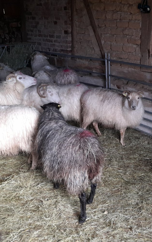 Nachdem das Piepen sehr viel Zeitersparnis liefert, konnten wir dann noch Mert und die Lämmer verladen und Mert gleich wieder in die Scheune ausladen werden. Dort wartete eine Hilla unter Schock. Sie hat das halbe Inventar auseinander genommen und blieb dem Himmel sei Dank unverletzt. Zu ihrem Ensetzen kam dann Mert, der sie gleich beglückt durch die Scheune scheuchte. Hilla findet das höchst gewöhnungsbedürftig. Mert ist im 7. Himmel