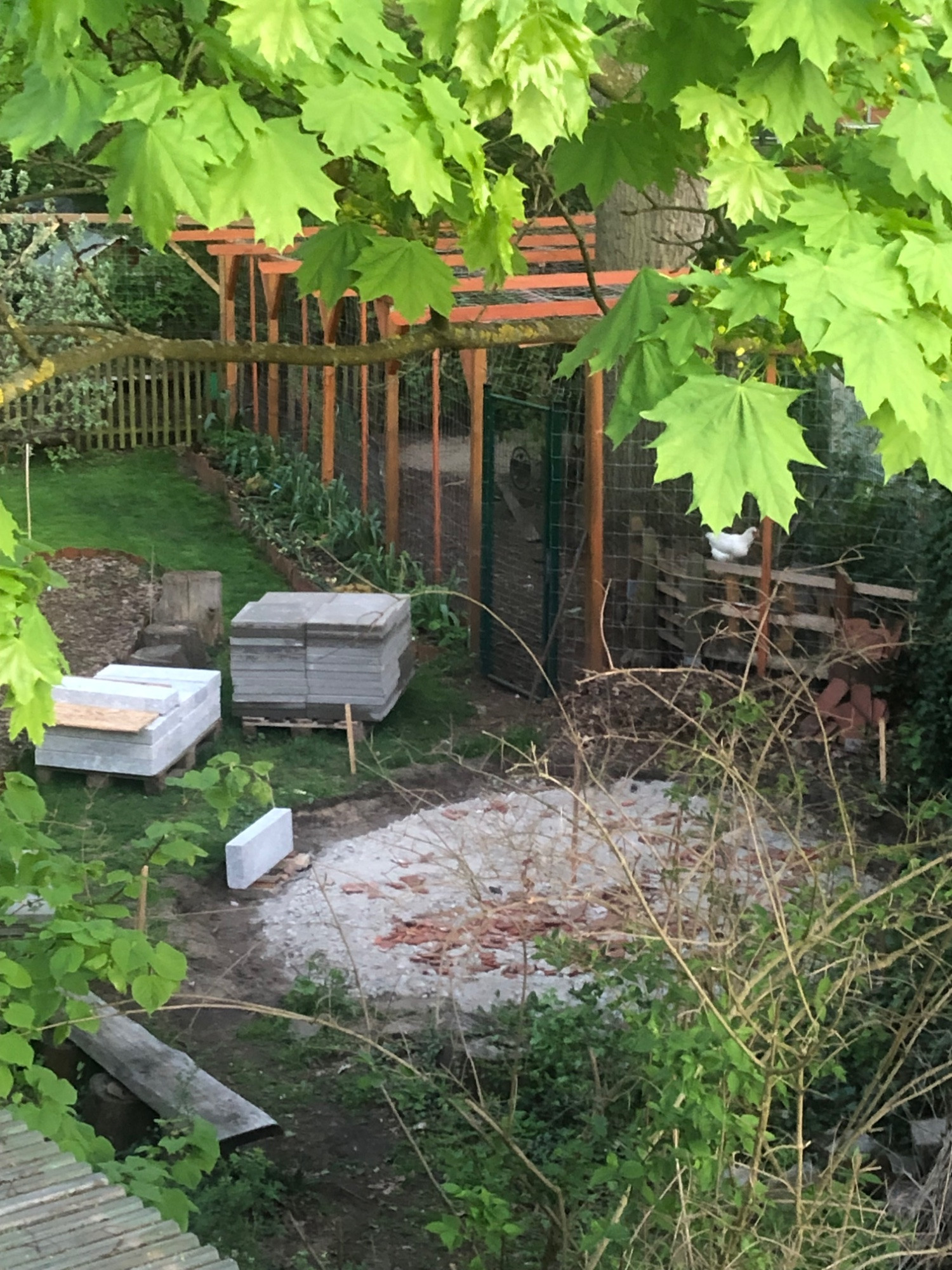 Außerdem gibt es gerade ein großes achteckiges Loch im Boden neben dem Hühnergehege. Dort bauen wir einen Holzpavillon hin: