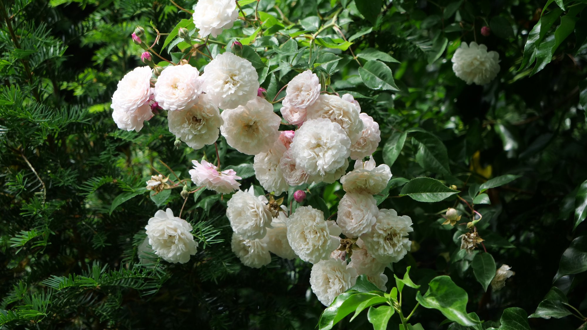 Celsiana ist wirklich ein Monster, das überall wächst, total anspruchslos. Bei meiner Tochter auf felsigem Untergrund ist sie ca. 2 m groß und ebenso breit (da ist vermutlich die Wurzelechtheit - ursprünglich waren meine drei Ausläufer aus dem Schloßgarten von Drosendorf - ein Vorteil), aber, und das hatte ich am wenigsten geglaubt, ebenso hier im zweiten Hinterhof bei einem Nachbarn mit Gartenzugang, der zwar etwas mehr Sonne hat als das Schattenreich, aber auch eher bescheiden. Da hatte ich sie an die Mauer gesetzt, in Schotter und Steine ein Loch gegraben und mit viel Kompost gefüllt. Sie zog sofort los, wollte Kletterrose spielen, wurde aber trotz meiner Warnungen nicht aufgebunden und ist jetzt ein riesiger Rosenberg, der heuer massenhaft Blütentriebe produziert hat