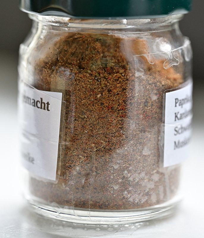 Paprika, Koriander, Zimt, Kardamom geschält, Kreuzkümmel, Schwarzkümmel, Piment, Muskatnuss, Pfeffer, Gewürznelke.