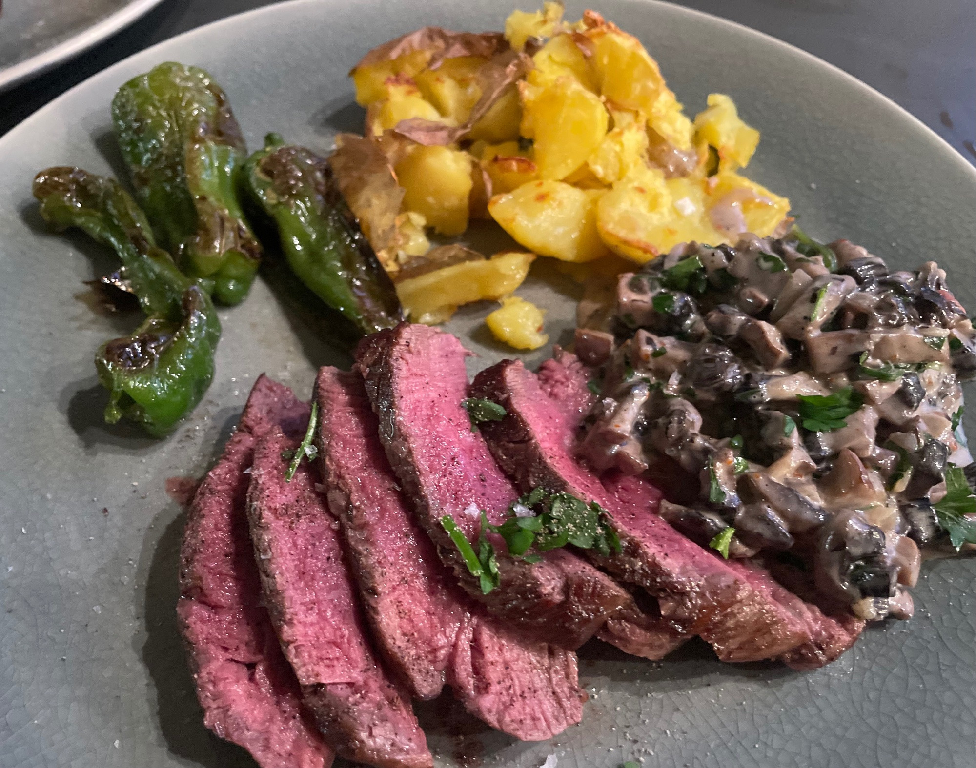 Bei uns gab es heute sehr gutes Rinderfilet mit zerdrückten (mashed) Kartoffeln, Pimientos de Padron und Portobellos in Sahnesauce. Die vorgekochten Kartoffeln wurden im Airfryer nachgeröstet.