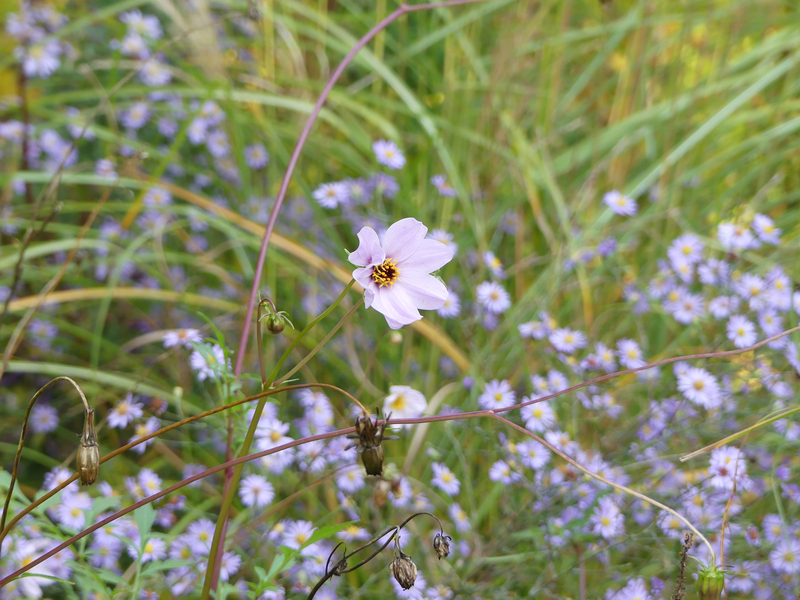Ich habe ja schon letztes Wochenende ausgebuddelt. Einzig Dahlia merckii ist noch und bleibt auch wieder in der Erde. Momentan blüht sie in netter Gesellschaft von Aster laevis.