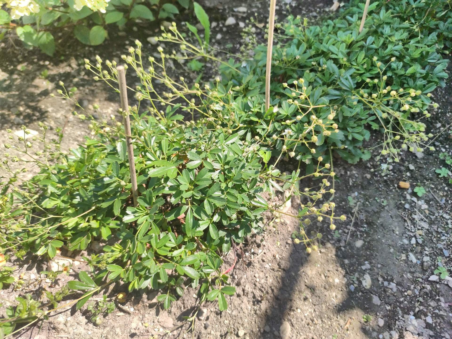 Potentilla x tonguei ist bei mir vor einer Hortensie. Alles im 1. Jahr, die sollen sehr viele Blüten in apricot bekommen, wobei das Ausläufer sind, die nicht anwurzeln.