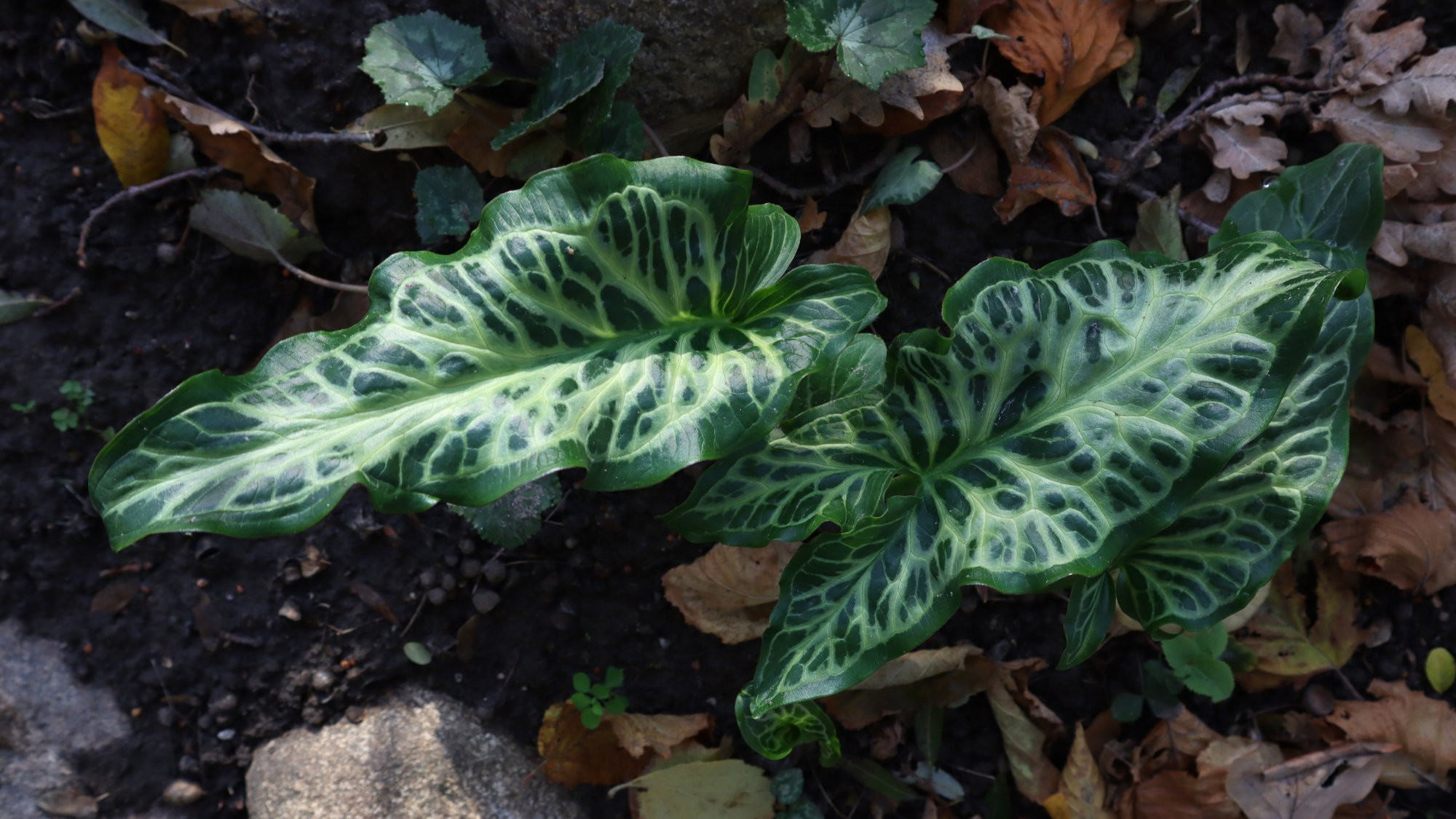Ja, die Hybriden haben gewöhnlich den herbstlichen Austrieb von Arum italicum geerbt und manchmal auch schwarze Zeichnung von Arum maculatum. Die ist dann aber gewöhnlich nicht so tief eingesunken im Blatt wie bei unserem einheimischen Aronstab. Mich hatte überrascht, dass ´Chamaeleon´wohl auch eine Hybride ist - da hätte ich das auf den ersten Blick nicht vermutet.