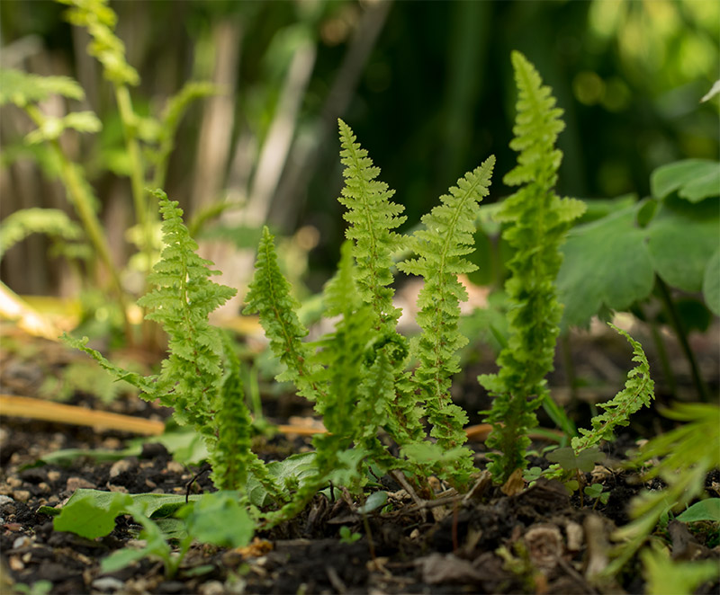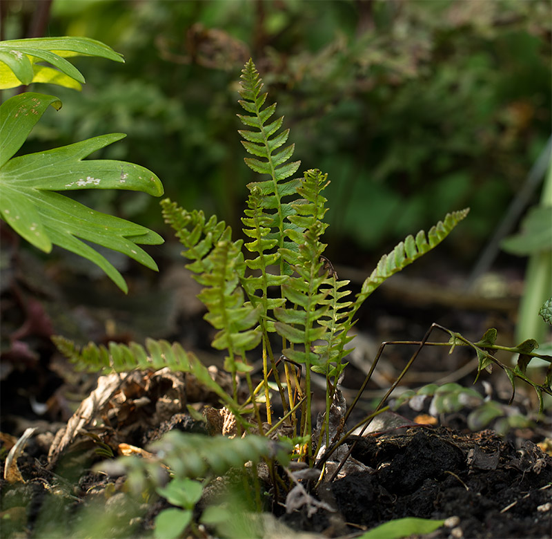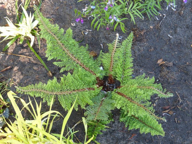 Vom riesigen Osmunda mal zu einem kleineren Farn. Blechnum microphyllum (Danke nochmal) im Austrieb, daneben ein Eranthis Blatt. Er wird wohl noch die doppelte Höhe erreichen.