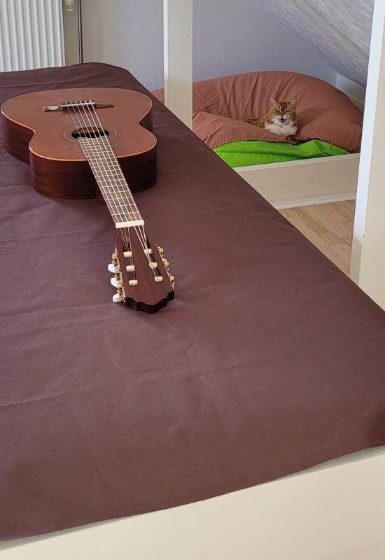 ( Die Gitarre dient der Abschreckung vom Gästebett. Wenn ich ihr nämlich Töne entlocke, scheint das in M a d a m e s Öhrchen wie " Baobao"-Genöhle zu klingen und sie hält gehörigen Abstand ;D ;D ;D)