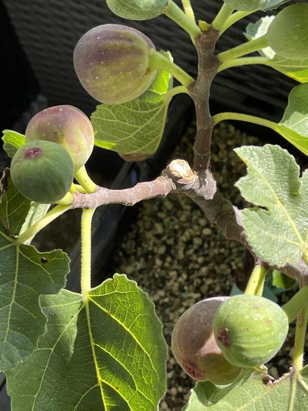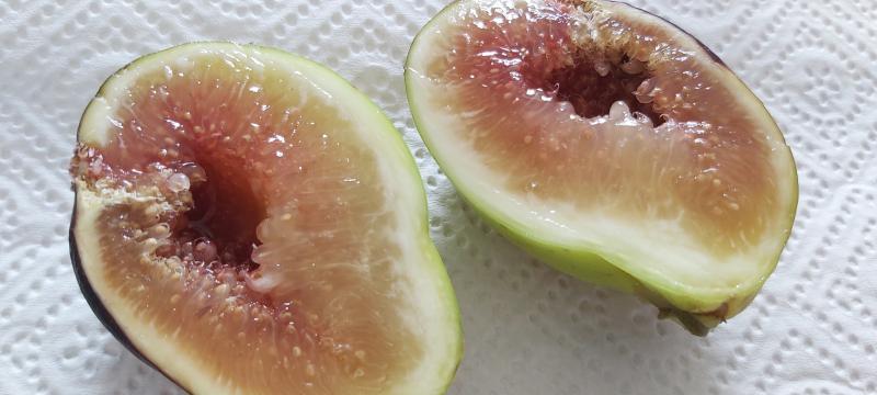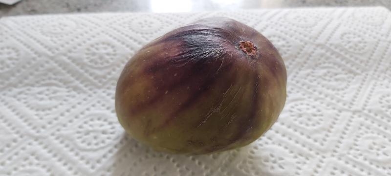 Auf dem Foto eine heute morgen geerntete Feige. Sieht aus wie eine Brown Turkey, ist aber wahrscheinlich keine. Die Sorte ist mir leider nicht bekannt. Als ich sie vor zwei Jahren gekauft hatte, war ich noch Feigenneuling und hatte nicht auf das Sortenschild geachtet. Sie ist bislang sehr schwachwüchsig. Zuwachs in diesem Jahr lediglich ca 5 bis 7 cm. Bisher habe ich an der Pflanze nur Herbstfeigen gesehen. Die Früchte werden ziemlich groß (um die 90 bis 100 Gramm). Wenn die Früchte direkt von der Sonne beschienen werden, färben sie sich meist tief lila, nur der obere Teil am Hals bleibt dann grün. Die hier gezeigte Frucht war vom Blattwerk ziemlich beschattet und hat deshalb keine so ausgeprägte lila Färbung. Die Textur der reifen Frucht ist zart, saftig, der Geschmack ist süß, melonig, erinnert sehr an Honig, die Kerne sind kaum zu spüren. Mir hat sie super geschmeckt. Neben Negronne ist das bislang meine bevorzugteste Sorte. Das Geschmacksprofil erinnert mich an Dottato (ebenfalls Typ Honigfeige), aber diese Feige hier wird größer und schmeckt mir auch besser als Dottato. Die Dottato ist deshalb bei mir wieder rausgeflogen.