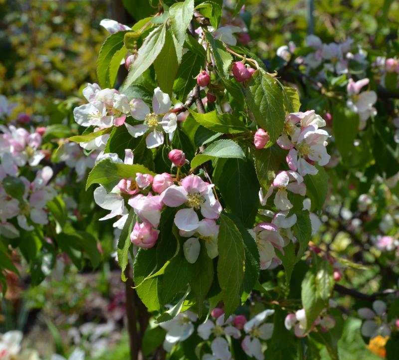 Das stimmt.Der Cornus mit den Riesenblüten ist auch außergewöhnlich. Zierapfel "Maypole" ist auch sehr schön, aber Platz für noch mehr Zieräpfel habe ich leider nicht. Zumal ich noch drei Sämlinge von den hier gezeigten ausgepflanzt habe. "Evereste" und "Red Sentinel" alternieren beide, glücklicherweise aber nicht im gleichen Rhythmus. "Van Eseltine" biegt sich jedes Jahr unter der Last der Blüten.Viburnum sargentii 'Onondaga' - schon vor der Blüte eine Augenweide.