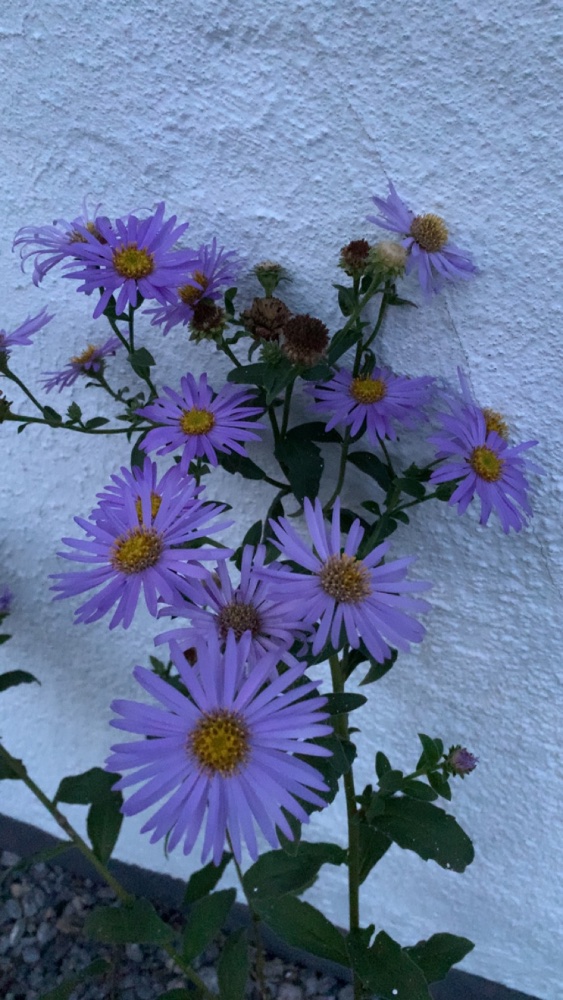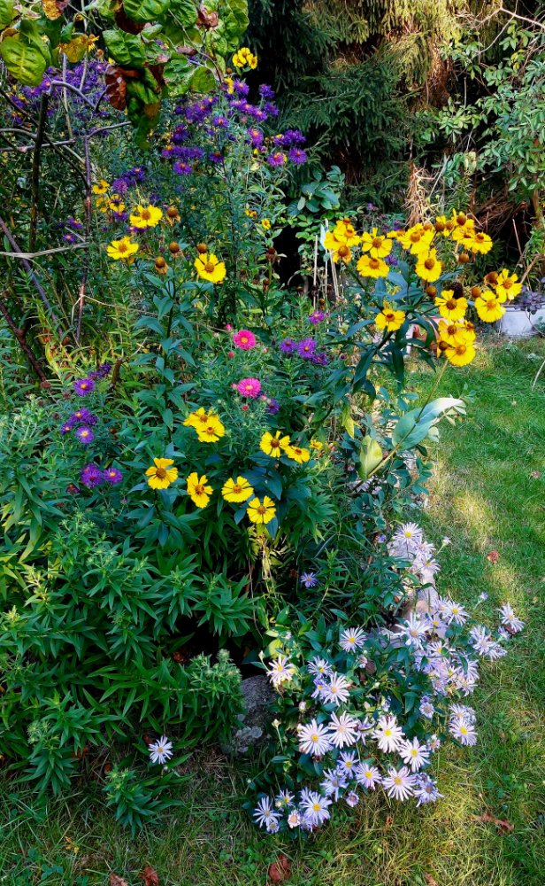 Hier blühen schon einige Herbstastern. Besonders freue ich mich über Aster novae-angliae Semptemberrubin. Die war im ersten Standjahr 2023 nämlich eine pilzverdorrte Vollkatastrophe. Dieses Jahr sieht sie viel besser aus. Das Laub ist gesund und es gibt noch viele Blüten.