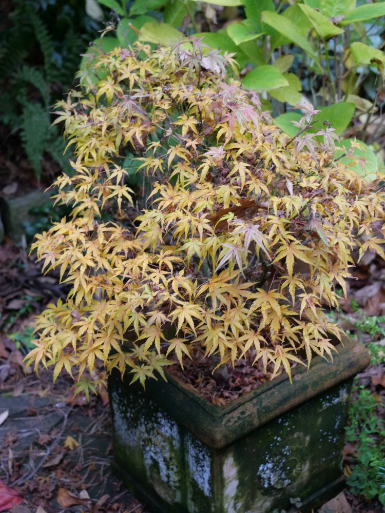 Hier haben mittlerweile nur noch zwei Ahorne Laub, die kleine 'Little Princess' in der Schale am Eingang und mein 'Going Green' im Topf, alle anderen haben die Blätter mittlerweile verloren. Ein paar verloren das Laub schon sehr früh, noch vor der Herbstfärbung, es war teils auch ein wenig verpilzt, kein Wunder bei der übermäßigen Feuchtigkeit im Oktober. Bei den Ahornen unterm Dach vertrocknet es manchmal auch, da war's dann vielleicht wieder zu trocken - es ist nicht immer ganz einfach, die richtige Balance beim Gießen zu finden. Wahrscheinlich mögen es die Ahorne einfach auch "luftiger", und so ein Standort unterm Terrassendach ist je nach Witterung nicht ganz optimal.
