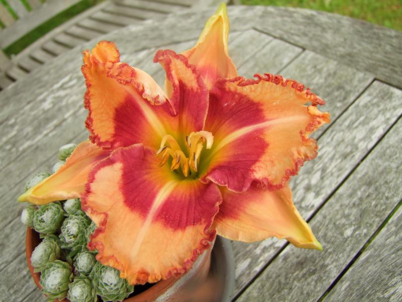Die von Dir gezeigte Blüte hat eine gewisse Ähnlichkeit mit 'Spellbound Secret' von Salter, finde ich. (Foto bei Taglilien-Hosta z.B.)