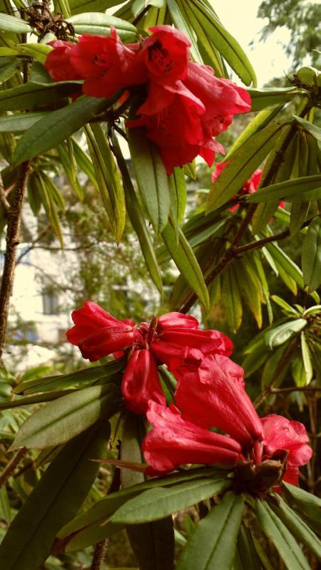 R.arboreum Bu 100 Ghorepani/Nepal 2500m 1990 gesammelt.Erste Blüten nach 23 Jahren.Ist wegen der niedrigen Ursprungshöhenlage sehr empfindlich.Vorletzten Winter etwas geschädigt.