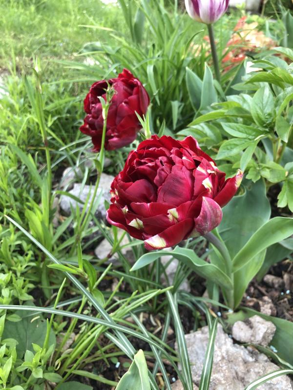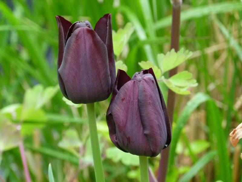 Ich habe nur Einzelblüten zu zeigen. Dieses müsste 'Black Night' sein, wenn ich es mir richtig merkte. Im Kübel, auch letztes Jahr schon. Habe sie dann bis zum vollkommenen Einzug der Blätter im Kübel belassen und danach die Zwiebeln trocken gelagert. Klappte prima. Allerdings haben sie im letzten Jahr auch viel Flüssigdünger erhalten, das ist in diesem Jahr nicht so.