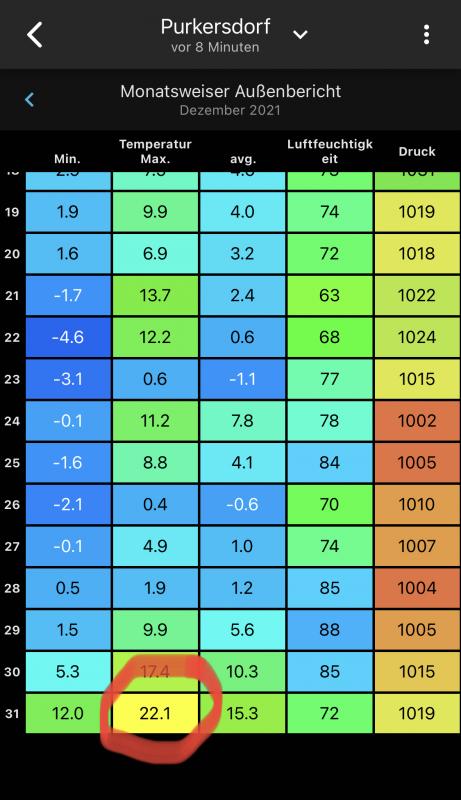 Somit in jedem Monat zumindest 1 x über 20 Grad im Jahr 2021.