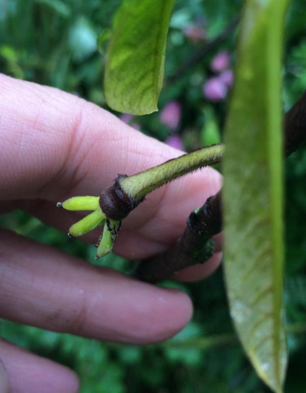 Bei einer meiner zwei Pawpaws gibt es nun nach der reichen Blüte einen einzigen Fruchtansatz. Ich hoffe er wird nicht abgeworfen aber bis jetzt sieht er gut aus.