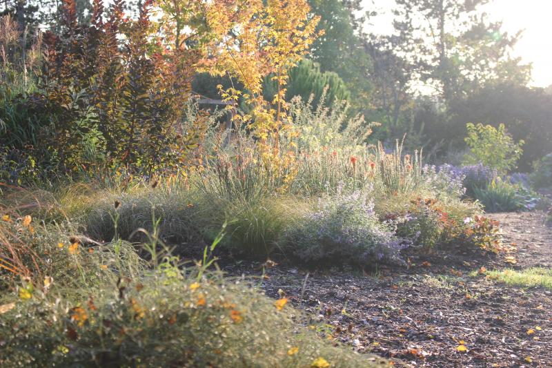 Am späten Nachmittag, wenn die Sonne tief steht, ist dieser Bereich immer am schönsten, bietet er doch ein wunderbares Licht- und Schattenspiel, welche die vielfältige Gestaltung besonders zur Geltung bringt. Neben den bodendeckenden Schattenstauden sorgen vor allem Gräser für vertikale Akzente, und die panaschierten Iris strecken ihre Schwerter wie gespreizte Finger in die Sonne. Der Kugellauch ziert auch mit seinen abgeblühten Fruchständen noch eine ganze Weile.