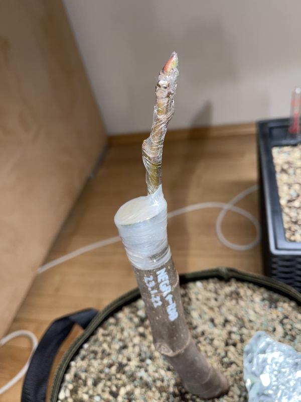 Hatte auch das Phänomen mit den oberirdischen Wurzeln an ner Domenico Tauro, die anfangs mit Parafilm umhüllt war. Als sie genug Wurzeln hatte und oberirdisch auch ausgetrieben hat, hab ich den Parafilm entfernt und die Wurzel trocknete innerhalb von nen Tag sichtbar ein.