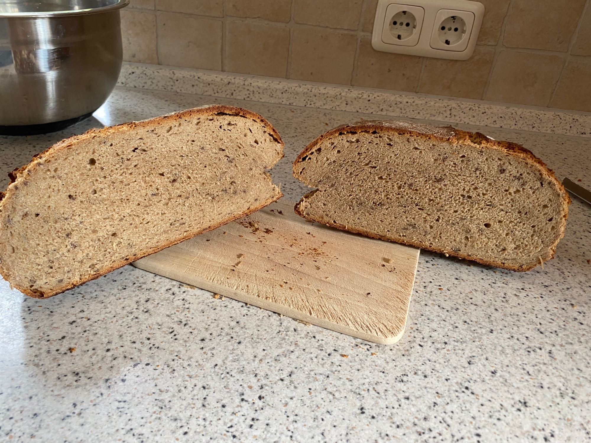 Heute waren es zwei Laibe mit je 1650g, Übernachtgare, geschmacklich sehr gut.