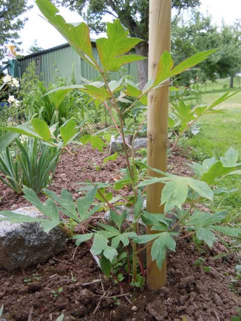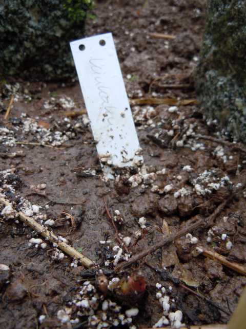 Hier nochmal die Pflanzung meiner P. "Souvenir de Prof. Maxime Cornu" im März 2014. Ich hatte das Glück, dass die komplette Pflanze noch nicht ausgetrieben war.Es schaut nur die Endknospe des 15 cm hohen Sträuchleins aus der Erde (vorn)
