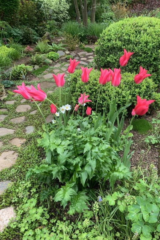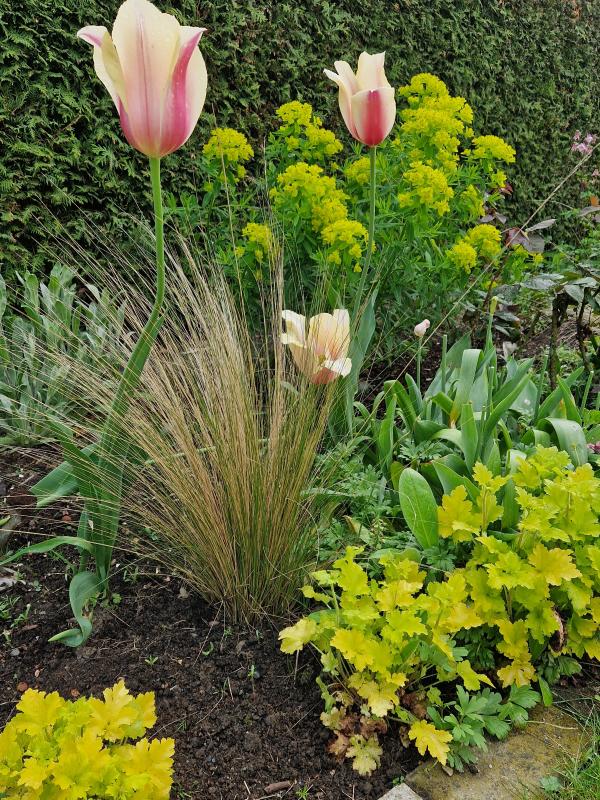 Hier hatte ich eigentlich eine Tulpe zwischen den Acanthus gepflanzt, die irgendwas mit „Apricot“ im Namen hieß… sieht aber sehr nach „Mariette“ aus, oder?