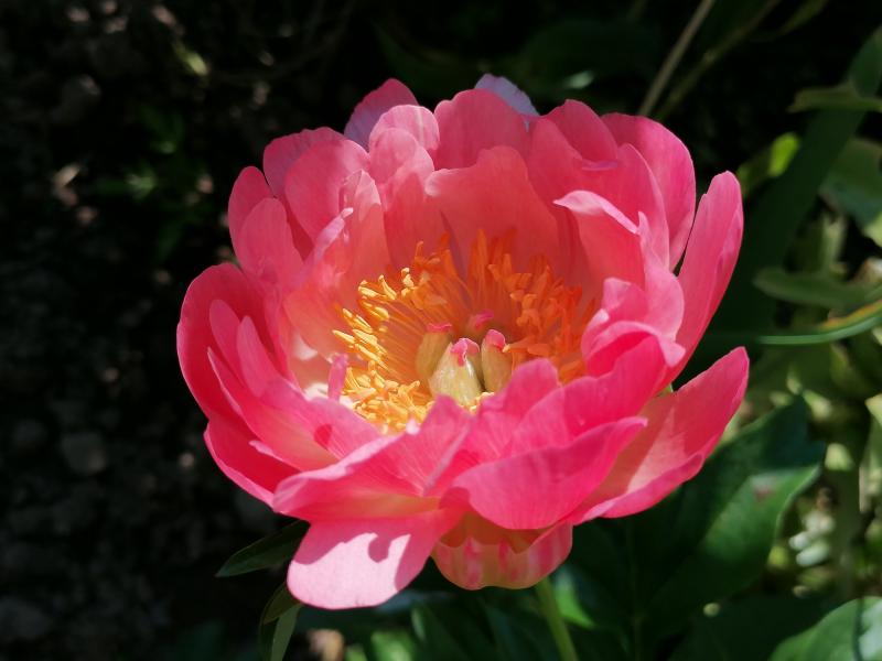 Sie steht bei mir im Halbschatten. So pink ist sie nicht, sie hat ein bisschen von Pfirsichfarbe. Und leuchtet weit.