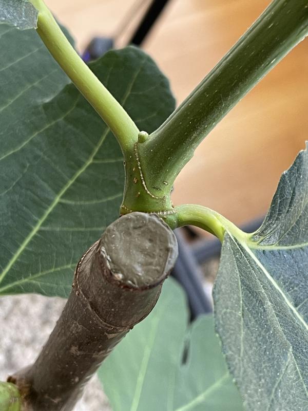 Der 1. Herbstfeigen-Knubbel ist 6-7 Wochen nach dem Headstart (19.1.2022) bei der „Genovese-Nero AF“ sichtbar.