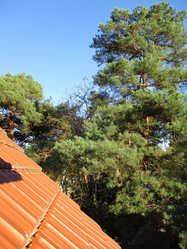 Hier ein Blick aus dem (Dach)Fenster bei der kleinen Tochter "in" unseren Garten. Die Nachmittagssonne schien grad so schön :D. Man erkennt ganz gut 3 unserer Kiefern und die Walnuss.
